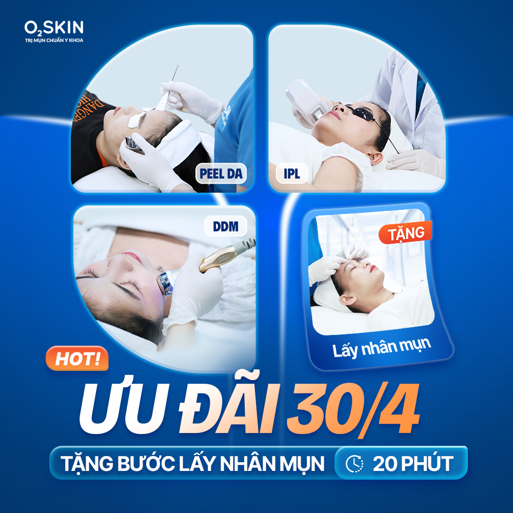 Duy nhất từ 15/04 đến 30/04, O2 SKIN dành tặng suất lấy nhân mụn chuẩn y khoa (20 phút) cho khách hàng sử dụng dịch vụ Peel da, IPL hoặc DDM trong khung giờ vàng (13h – 16h, Thứ 2 – Thứ 6). Đây là giải pháp điều trị kết hợp giúp giải phóng bít tắc, hỗ trợ gom cồi nhanh và rút ngắn tối đa thời gian phục hồi da.